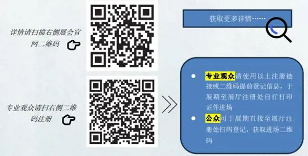 普通观众:无需注册,可在展会期间直接至展厅登记后扫码获取入场二维码,免费入场。